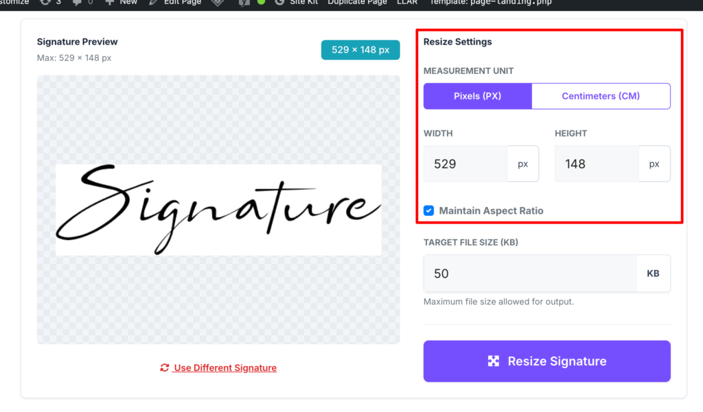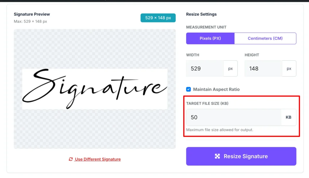 Click the “Resize Signature” button. A preview will appear showing you exactly how the signature looks and what the final file size will be.